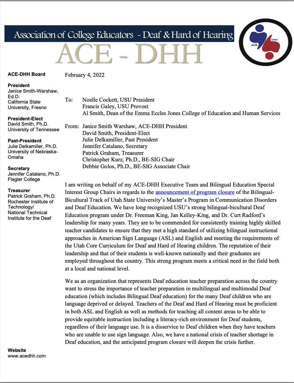 We write to urge you to maintain the Bilingual-Bicultural ASL/English Deaf Education program at Utah State University. As the organization representing the executive leaders of Deaf Schools and Programs across the United States, we recognize the value of USU’s graduates in their pedagogical and ASL skills that are essential to our ASL/English programs, and you will find USU graduates in many of our programs across the country, not only in the state of Utah.